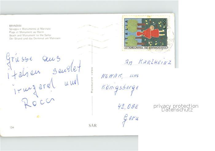 old postcard Brindisi Strand und das Denkmal der Matrosen postalisch gelaufen Erhaltung siehe scans