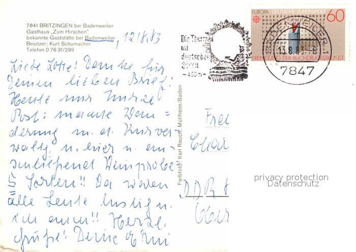 72631332 alte Postkarte Britzingen Gasthaus Zum Hirschen postalisch gelaufen Erhaltung siehe scans [LiesaD40] KatCode: 11110008315074