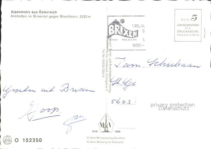72269546 alte Postkarte Brixen Thale Alpenmotiv Almhuetten im Brixental gegen Brechhorn postalisch gelaufen Erhaltung siehe scans KatCode: 11390335070402