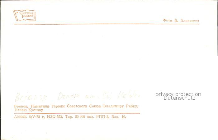 Brjansk Denkmal W. Rjabka W. Safonowoj postalisch nicht gelaufen Erhaltung siehe scans