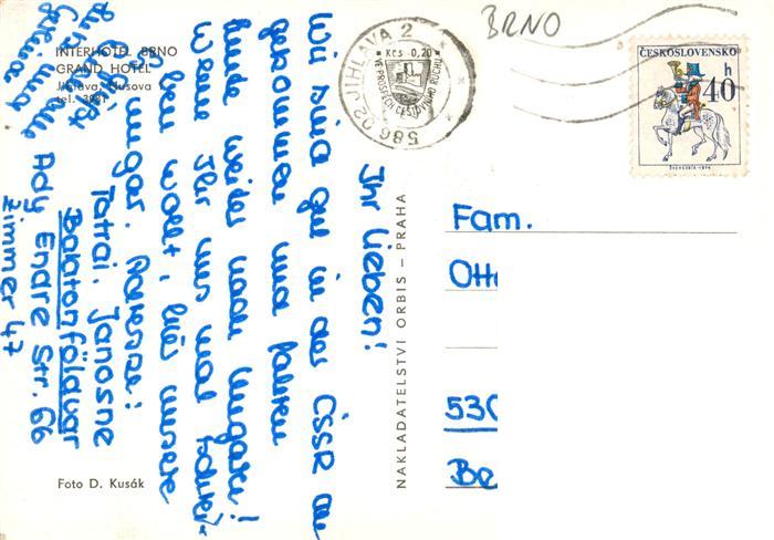 73863844 Brno Bruenn CZ Grand Hotel Interhotel postalisch gelaufen Erhaltung siehe scans [FriedD77] old postcard Frie Katcode 11520