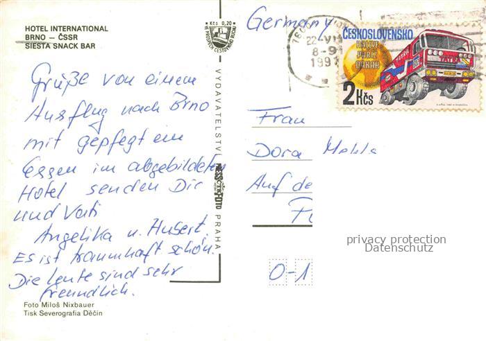 74023228 old postcard BRNO Bruenn CZ Hotel International Siesta Snack Bar postalisch gelaufen Erhaltung siehe scans [FriedD77] KatCode: 11520