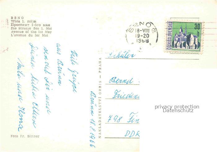 34143154 old postcard BRNO Bruenn CZ Strasse des 1. Mai postalisch gelaufen Erhaltung siehe scans [FriedD77] KatCode: 11520