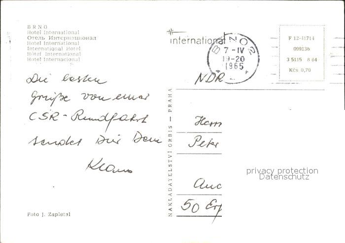 12572876 old postcard Brno Bruenn Hotel International postalisch gelaufen Erhaltung siehe scans [NatalD47] KatCode: 11520