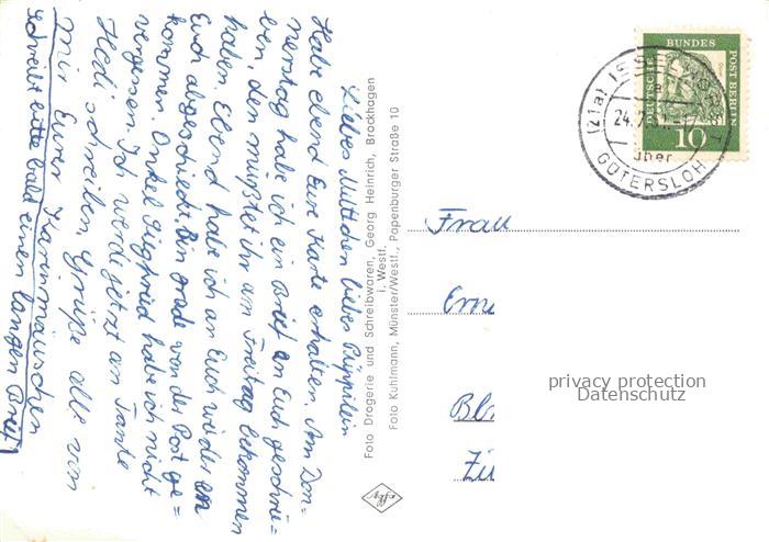 74106426 alte Postkarte Brockhagen Steinhagen Guetersloh NRW Ortsmitte Foto Drogerie Heinrich Muehlenteich Schwaene Schloss Patthorst Schule postalisch gelaufen Erhaltung siehe scans [FriedD77] KatCode: 11110005754040
