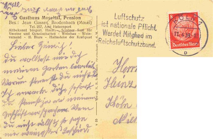 73974352 alte Postkarte Brodenbach Mosel Gasthaus Pension Moseltal Gastzimmer postalisch gelaufen Erhaltung siehe scans [FriedD77] KatCode: 11110007137205