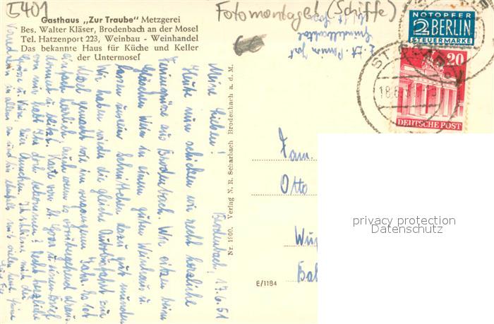 73695307 alte Postkarte Brodenbach Mosel Panorama mit Gasthaus Zur Traube postalisch gelaufen Erhaltung siehe scans [WerneD78] KatCode: 11110007137205