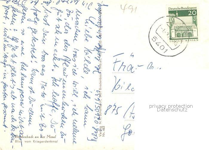 73176039 alte Postkarte Brodenbach Panorama Blick vom Kriegerdenkmal Mosel Weinberge postalisch gelaufen Erhaltung siehe scans [FriedD77] KatCode: 11110007137205