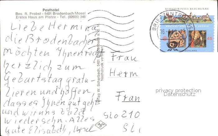 71902283 alte Postkarte Brodenbach Posthotel an der Mosel Fahrgastschiff postalisch gelaufen Erhaltung siehe scans KatCode: 11110007137205