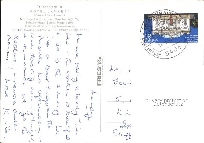 alte Postkarte Brodenbach Terrasse vom Hotel Anker blick auf das Personenschiff Poserdon postalisch gelaufen Erhaltung siehe scans