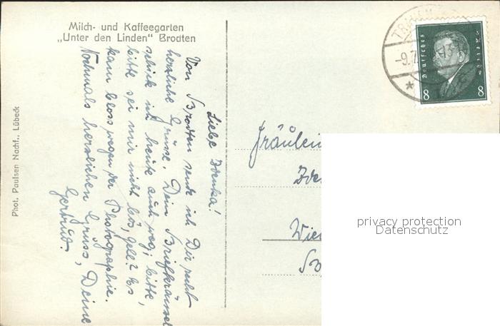 31715099 alte Postkarte Brodten Milch- und Kaffeegarten Unter den Linden postalisch gelaufen KatCode: 11110001003000