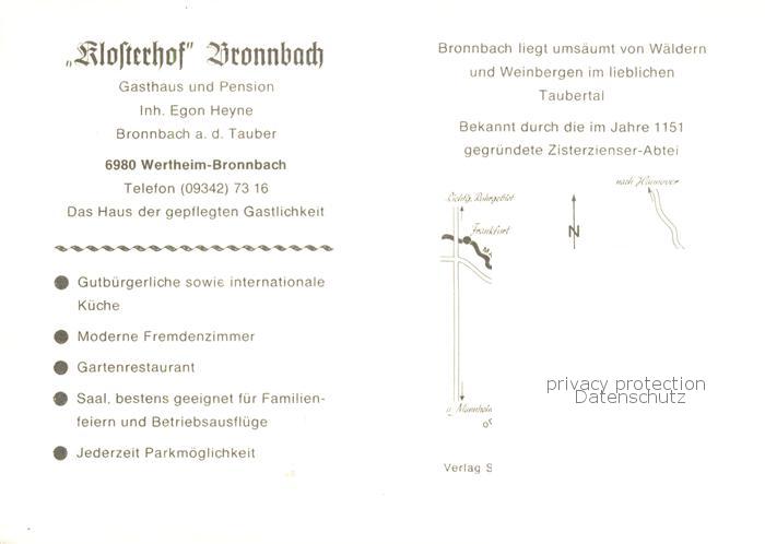 73866149 Bronnbach Gasthaus und Pension Klosterhof Gastraum Terrasse Kirche postalisch nicht gelaufen Erhaltung siehe scans [FriedD77] KatCode: 11110008128131
