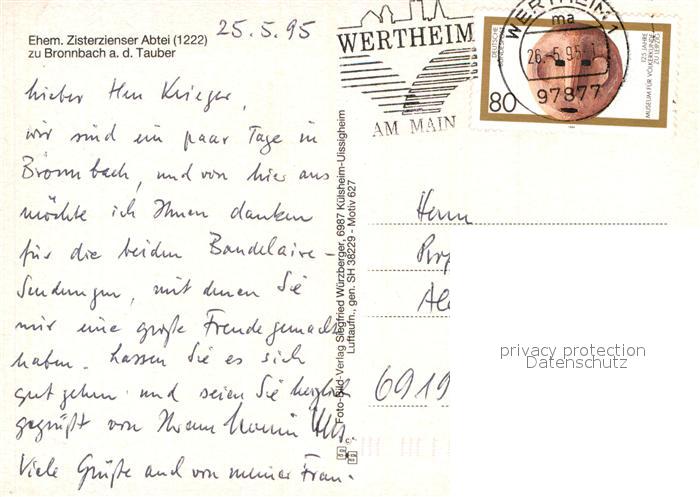 73016341 alte Postkarte Bronnbach Zisterzienser Abtei Fliegeraufnahme postalisch gelaufen Erhaltung siehe scans [NatalD47] KatCode: 11110008128131