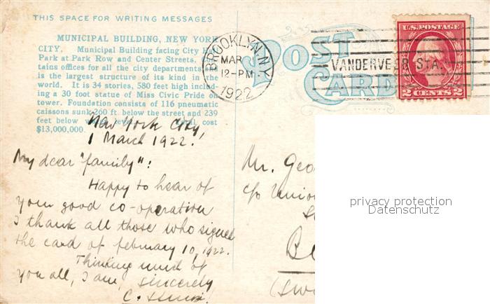 73297220 old postcard Brooklyn New York Municipal Building postalisch gelaufen Erhaltung siehe scans [WerneD78] KatCode: 14140340000000