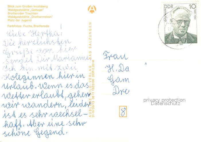 73157027 alte Postkarte Brotterode Gr Inselsberg Waldgaststaette Gehege Brotteroder Trachten Waldgaststaette Dreiherrnstein Platz der Jugend postalisch gelaufen Erhaltung siehe scans [WerneD78] KatCode: 11110016066014