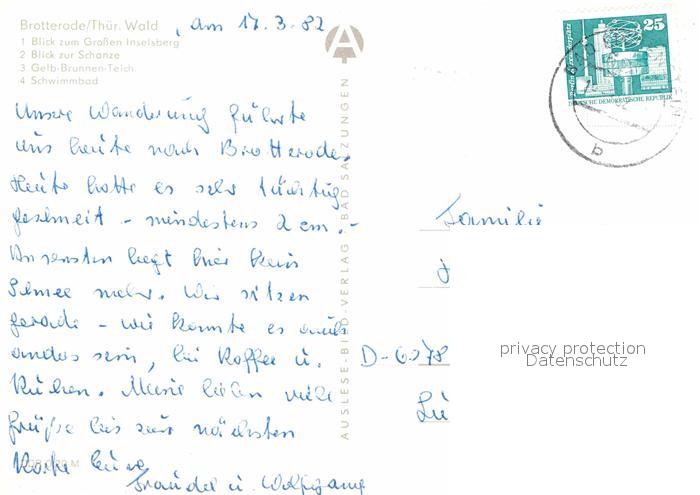 72917824 alte Postkarte Brotterode Grosser Inselsberg Schanze Gelb-Brunnen-Teich Schwimmbad postalisch gelaufen Erhaltung siehe scans [LiesaD40] KatCode: 11110016066014