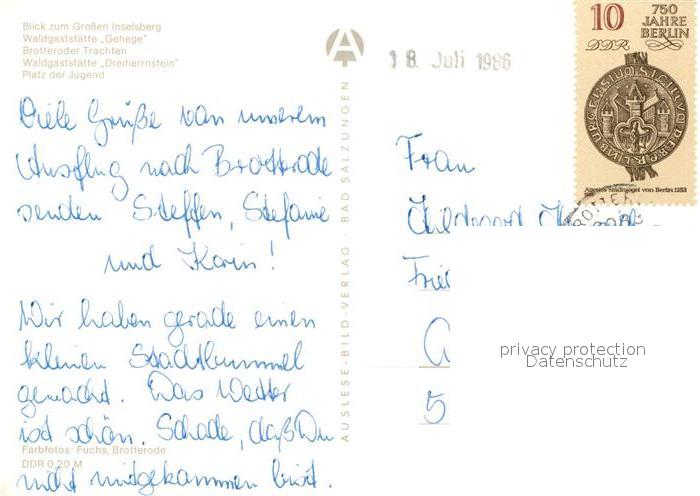 72972921 alte Postkarte Brotterode Grosser Inselsberg Waldgaststaette Brotteroder Trachten Platz der Jugend postalisch gelaufen Erhaltung siehe scans [FriedD77] KatCode: 11110016066014