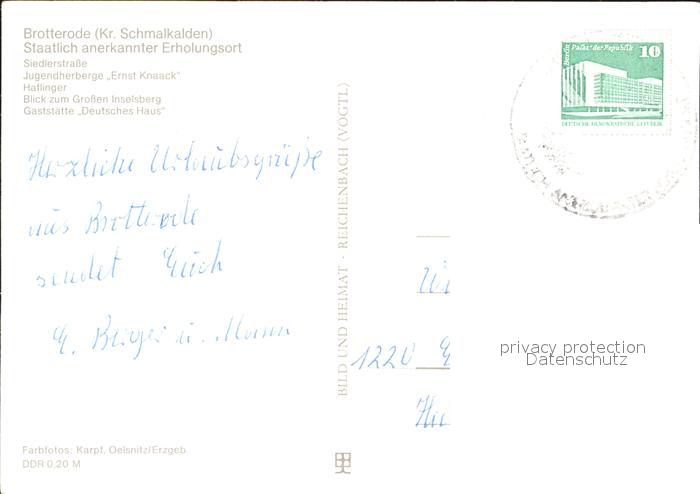 72263525 alte Postkarte Brotterode Siedlerstrasse Jugendherberge Erns Knaack Grosser Inselsberg Restaurant Deutsches Haus postalisch gelaufen Erhaltung siehe scans KatCode: 11110016066014