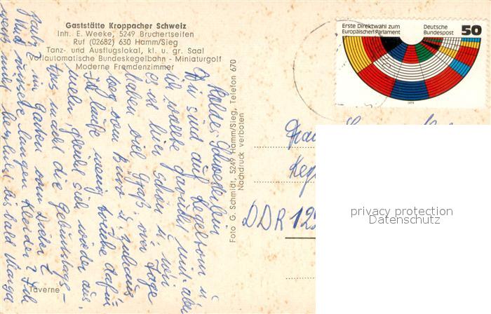 73706975 alte Postkarte Bruchertseifen Gaststaette Kroppacher Schweiz Taverne Tanz- und Ausflugslokal postalisch gelaufen Erhaltung siehe scans [FriedD77] KatCode: 11110007132014