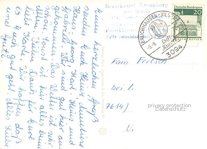 73839477 alte Postkarte Bruchhausen-Vilsen Heiligenberg Ringwall Buergerpark Kneippanlage Muehlenteich postalisch gelaufen Erhaltung siehe scans [FriedD77] KatCode: 11110003251010