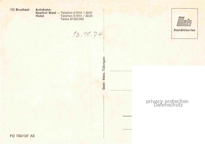 74154765 BRUCHSAL Baden Autobahn Rasthof West Hotel postalisch nicht gelaufen Erhaltung siehe scans [WerneD78] KatCode: 11110008215009