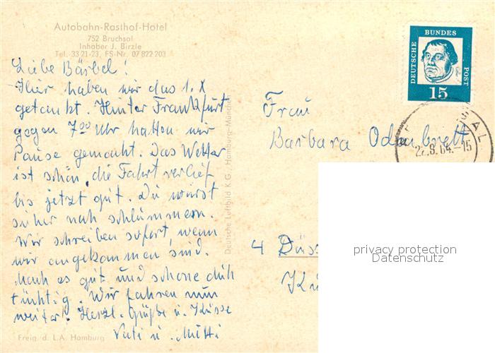 73051578 alte Postkarte Bruchsal Fliegeraufnahme Autobahn-Rasthof-Hotel postalisch gelaufen Erhaltung siehe scans [NatalD47] KatCode: 11110008215009