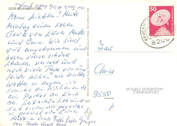 73673397 alte Postkarte Bruckmuehl Rosenheim Ortsansicht mit Kirche Motive Innenstadt Trachten postalisch gelaufen Erhaltung siehe scans [FriedD77] KatCode: 11110009187122
