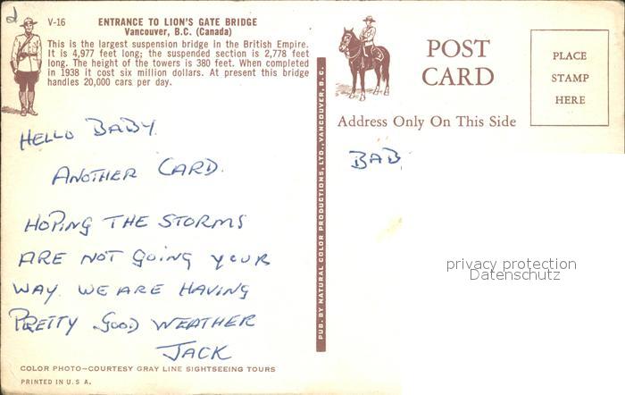 Bruecken Bridges Ponts Entrance Lion’s Gate Bridge Vancouver B.C. Canada postalisch nicht gelaufen Erhaltung siehe scans