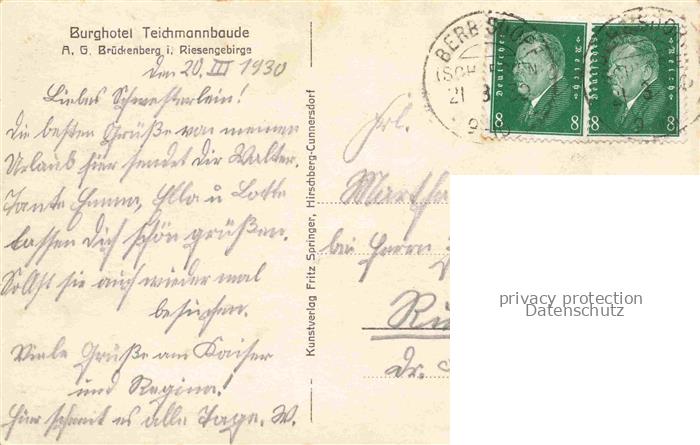 74033567 old postcard Brueckenberg Krummhuebel Riesengebirge PL Burghotel Teichmannbaude postalisch gelaufen Erhaltung siehe scans [FriedD77] KatCode: 11410