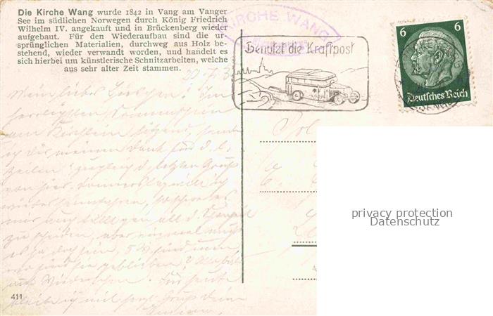 74015015 old postcard Brueckenberg Krummhuebel Riesengebirge PL Kirche Wang postalisch gelaufen Erhaltung siehe scans [FriedD77] KatCode: 11410