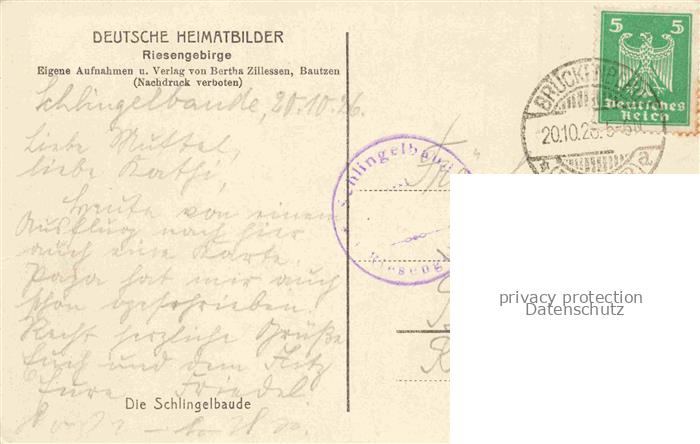 74030514 old postcard Brueckenberg Krummhuebel Riesengebirge PL Schlingelbaude Serie Deutsche Heimatbilder Riesengebirge postalisch gelaufen Erhaltung siehe scans [FriedD77] KatCode: 11410