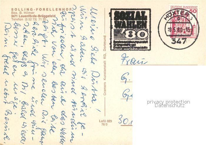 73654224 alte Postkarte Brueggefeld Lauenfoerde Solling Forellenhof Restaurant Terrasse postalisch gelaufen Erhaltung siehe scans [FriedD77] KatCode: 11110003255026