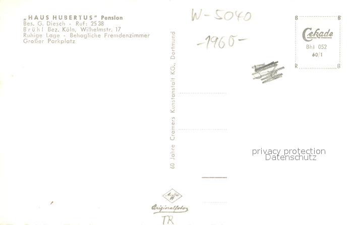 73690324 Bruehl Rheinland Haus Hubertus Pension Schlossstadt Schloss Augustusburg postalisch nicht gelaufen Erhaltung siehe scans [LiesaD40] KatCode: 11110005362012