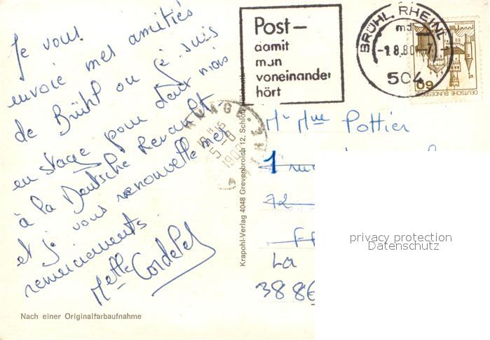 73663306 alte Postkarte Bruehl Rheinland Markt Stern Schloss Janshof Koelnstrasse Freibad Krankenhaus postalisch gelaufen Erhaltung siehe scans [WerneD78] KatCode: 11110005362012