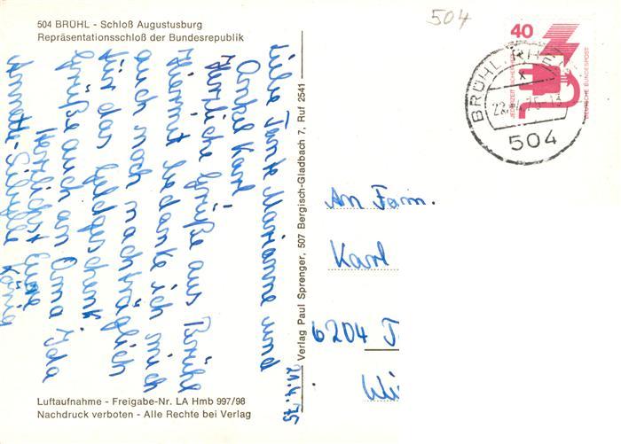 73941682 alte Postkarte Bruehl Rheinland Schloss Augustusburg postalisch gelaufen Fliegeraufnahme Erhaltung siehe scans [FriedD77] KatCode: 11110005362012