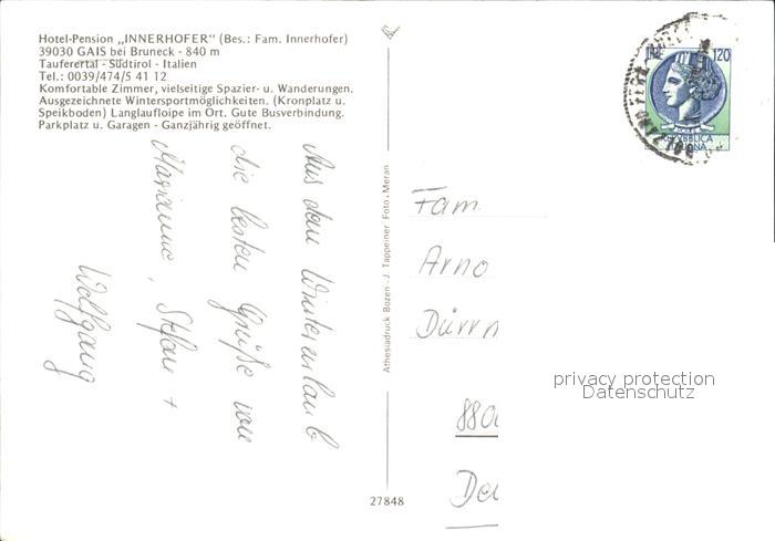 old postcard Bruneck Hotel Pension Innerhofer postalisch gelaufen Erhaltung siehe scans