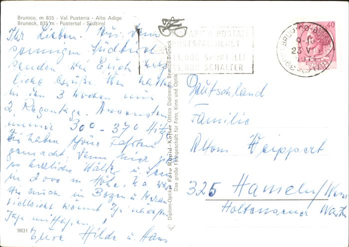 old postcard Brunico Val Pusteria Alto Adige postalisch gelaufen Erhaltung siehe scans