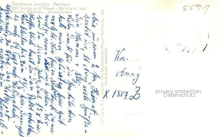 43350586 alte Postkarte Bruttig Mosel Gasthaus Pension Junglas Gastraum postalisch gelaufen Erhaltung siehe scans [FriedD77] KatCode: 11110007135017