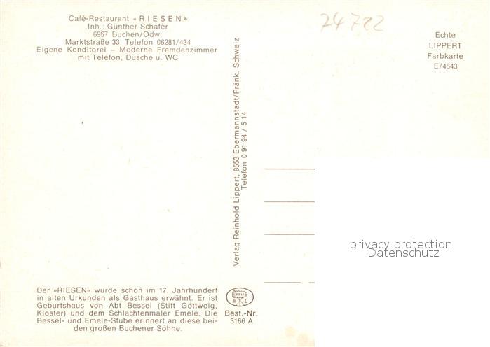 73862592 Buchen Odenwald Cafe Konditorei Restaurant Riesen Gastraum Fremdenzimmer Altstadt Fachwerkhaus postalisch nicht gelaufen Erhaltung siehe scans [FriedD77] Frie Katcode 11110008225014