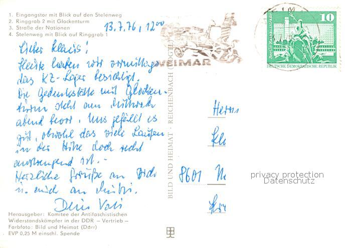 72951845 alte Postkarte Buchenwald Weimar Mahn- und Gedenkstaette Stelenweg Ringgrab 2 Glockenturm postalisch gelaufen Erhaltung siehe scans [PaolaD17] KatCode: 11110016055000