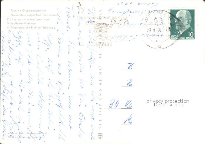 72324112 alte Postkarte Buchenwald Weimar Nationale Gedenkstaette Turm Gruppenplastik Eingang zum ehem Lager Strasse der Nationen Eingangstor mit Stelenweg postalisch gelaufen Erhaltung siehe scans KatCode: 11110016055000