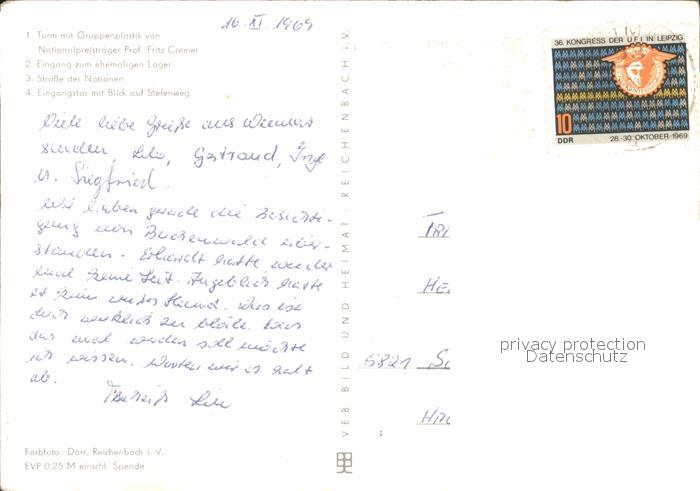 71939797 alte Postkarte Buchenwald Weimar Nationale Mahn Gedenkstaette Turm Gruppenplastik Eigang ehemalingen Lager Strasse Nationen postalisch gelaufen KatCode: 11110016055000