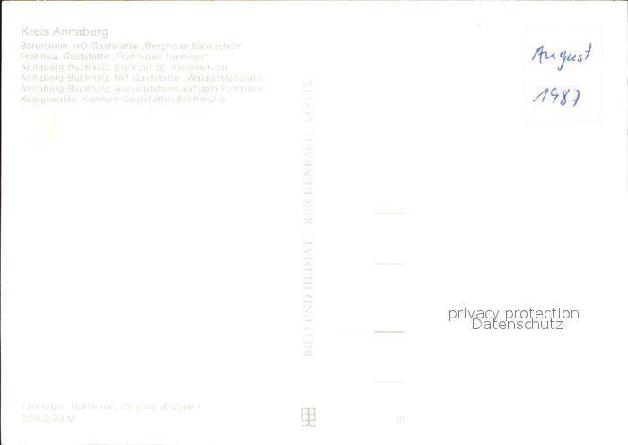 72071730 alte Postkarte Buchholz Annaberg Berghotel Baerenstein HO Gaststaette Frohnau Gaststaette Frohnauer Hammer St Annenkirche HOGaststaette Waldschloesschen Aussichtsturm Brettmuehle postalisch gelaufen Erhaltung siehe scans KatCode: 11110014171010