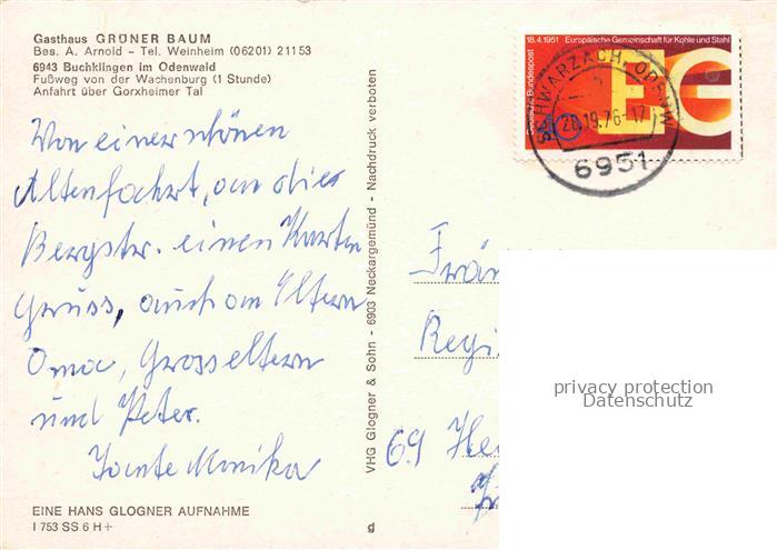 74048219 alte Postkarte Buchklingen Odenwald Gasthaus Gruener Baum Gastraum Ortsansicht postalisch gelaufen Erhaltung siehe scans [FriedD77] KatCode: 11110006431004