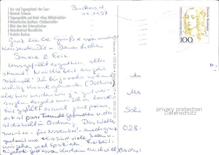72337075 alte Postkarte Buckow Maerkische Schweiz Kurhotel Keramik Scheune Gasthaus Schermuetzelsee Naturdenkmal Wurzelfichte Kurbahn postalisch gelaufen Erhaltung siehe scans KatCode: 11110012064084