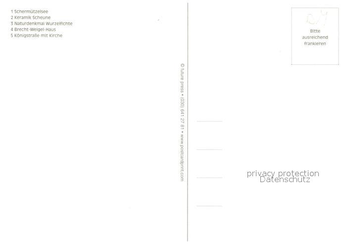73266115 Buckow Maerkische Schweiz Schermuetzelsee Keramik Scheune Naturdenkmal Wurzelfichte Brecht Weigel Haus Koenigstrasse Kirche postalisch nicht gelaufen Erhaltung siehe scans [FriedD77] KatCode: 11110012064084