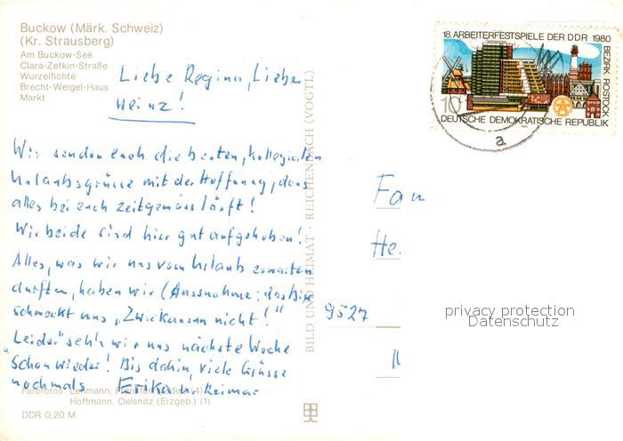 73124140 alte Postkarte Buckow Maerkische Schweiz Seepartie Clara-Zetkin-Strasse Brecht-Weigel-Haus Markt postalisch gelaufen Erhaltung siehe scans [LiesaD40] KatCode: 11110012064084
