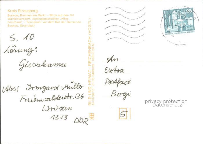 72401276 alte Postkarte Buckow Waldsieversdorf Brunnen Markt Ausflugsgaststaette Altes Forsthaus Sonnenuhr postalisch gelaufen Erhaltung siehe scans KatCode: 11110012064484