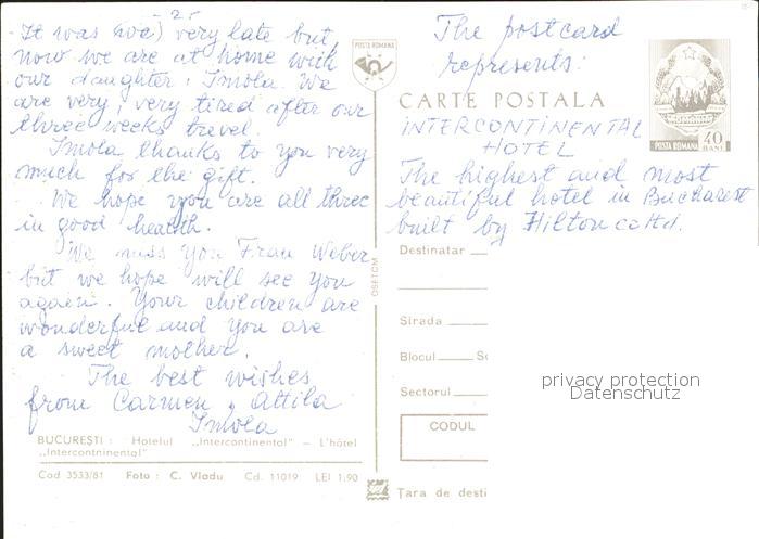 Bucuresti Bukarest Bucaresti RO Hotelul Intercontinental postalisch nicht gelaufen Erhaltung siehe scans