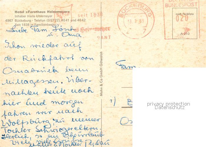 73569184 alte Postkarte Bueckeburg Hotel Forsthaus Heinemeyer postalisch gelaufen Erhaltung siehe scans [FriedD77] KatCode: 11110003257009